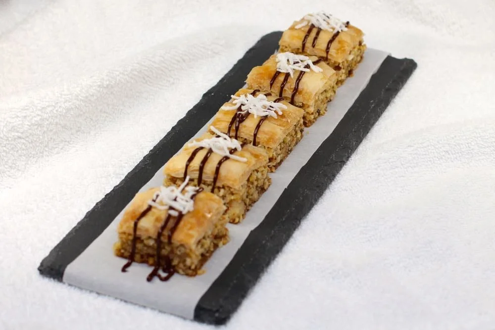 The time consuming part of baklava is in the pastry. It's easy enough to buy filo dough, but it has to be layered and brushed with coconut oil. I start out by brushing the pan with oil, then a sheet of dough, then brush with oil. I like to have 10-12 layers of dough for the bottom crust. Then, add the nuts, about a centimetre deep. The top pastry is the same procedure as the bottom crust, 10 layers of filo dough, brushed with coconut oil. It's important to cut the baklava prior to baking. Then bake ~20-30 minutes, or until the top is golden brown, at 350˚F.