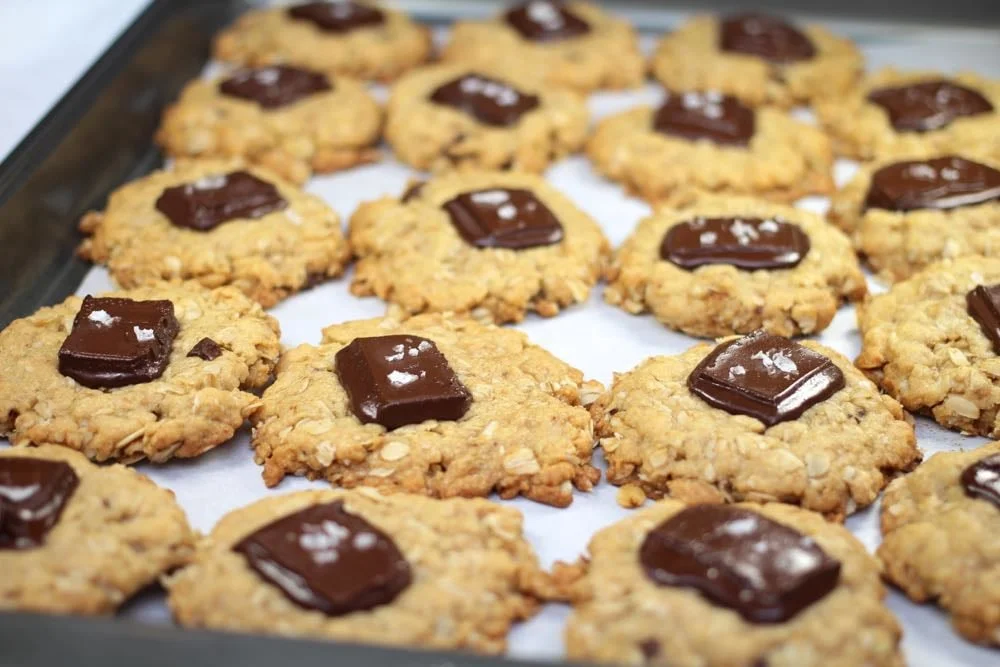 It's easiest to portion the cookie dough using a scoop. Onto a silicone baking mat (or parchment paper), flatten the lumps of dough and top with a square of chocolate. Add another dimension of flavour by garnishing the chocolate squares with a couple crystals of Maldon Salt.